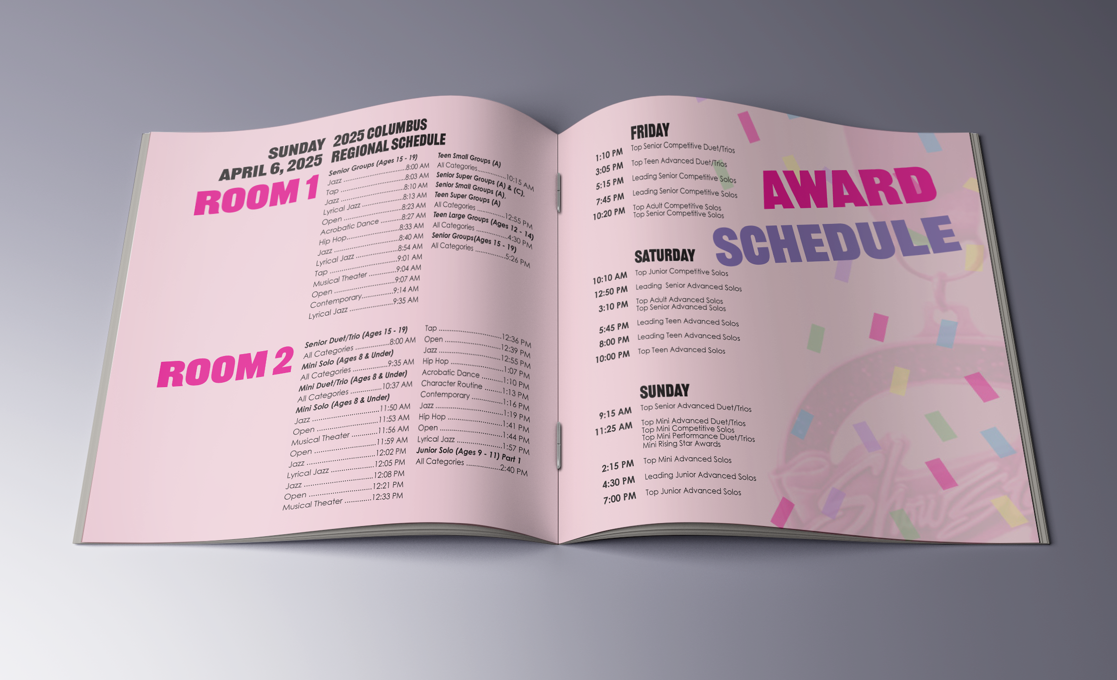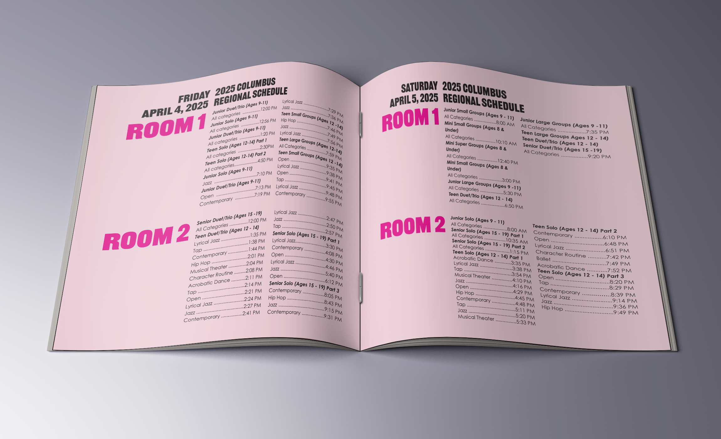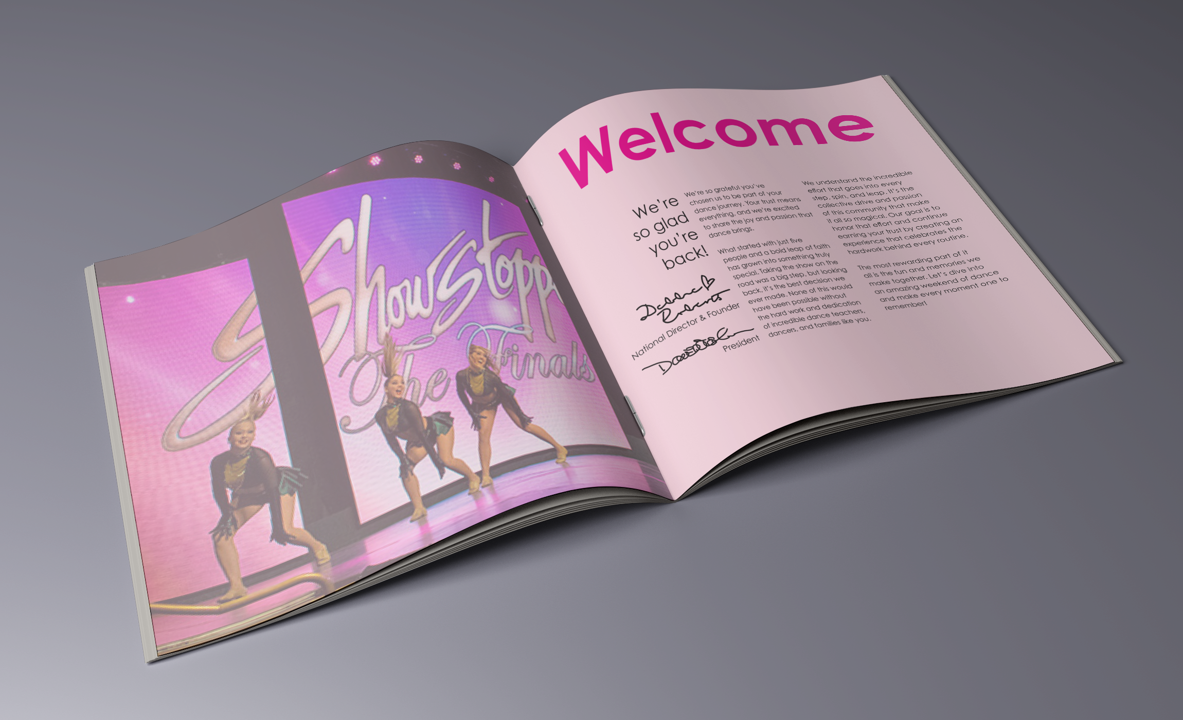 This project was approached with three notable requirements: relevant information for the respective print media, appropriate typographical hierarchies, and design consistency. The information for this event collected from the Showstopper Dance website were in the form of text documents. The challenge was to sort this information for relevance to the event system and then present it in a visually interesting way.