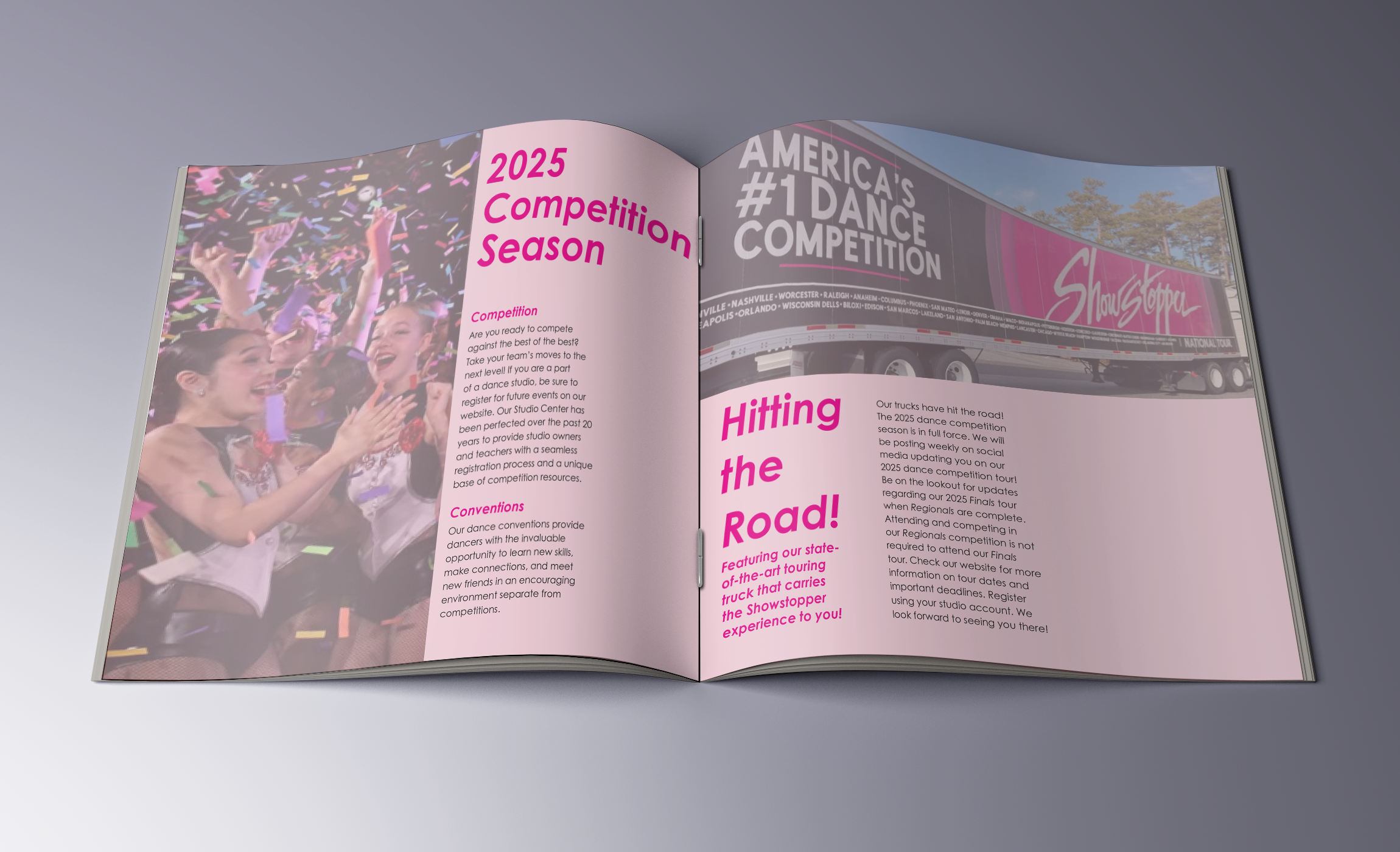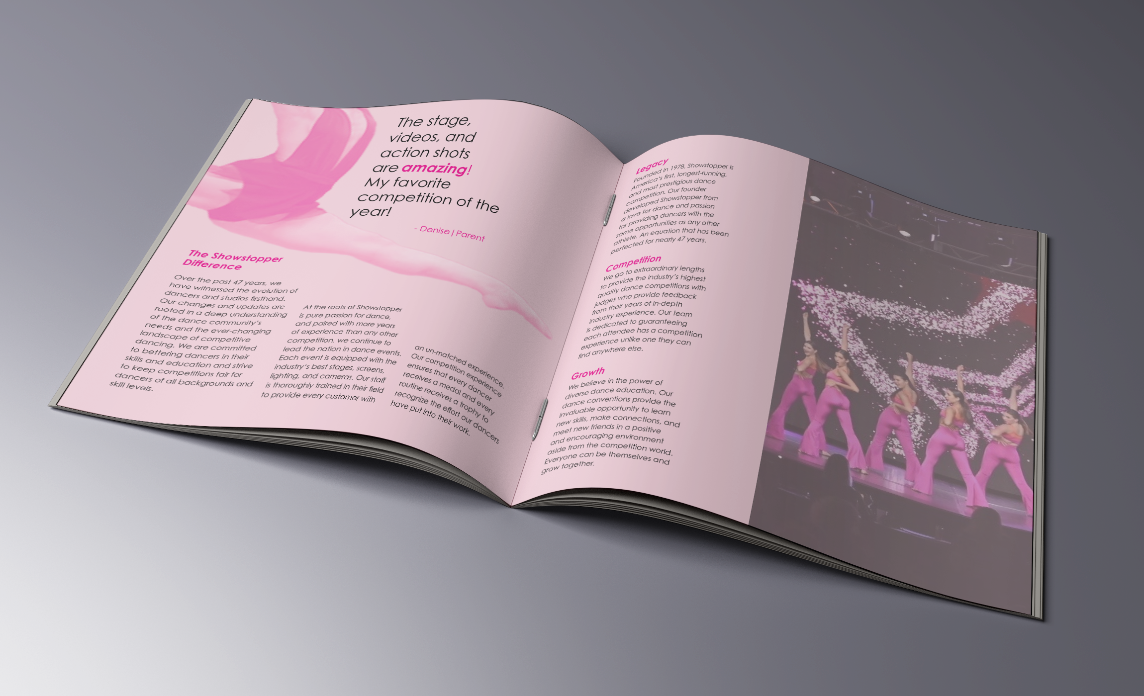 The objective for this project was to design a printed event system to communicate important information about a hypothetical event. The information needed to be displayed in the form of a poster, brochure, event badge, and announcement card. I was inspired by the Showstopper National Dance Competition and their upcoming competition in Columbus, Ohio. Using pieces of their existing branding and existing written information on their brand, the process was to assemble it accordingly for each form of printed media using my own proposed visual identity.
